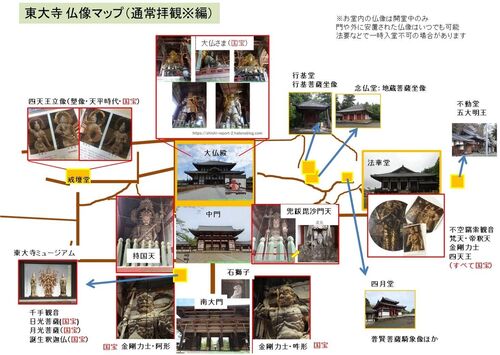 奈良・東大寺の仏像一覧。どのお像にどんな仏像が安置されているか、特別公開はいつか、など、境内マップに情報加筆の上、紹介しています。